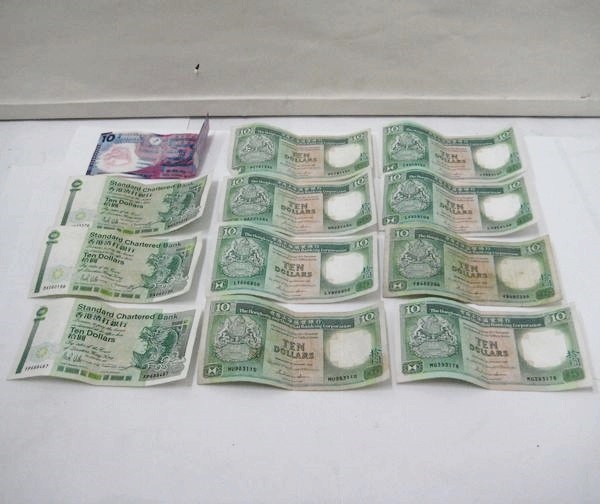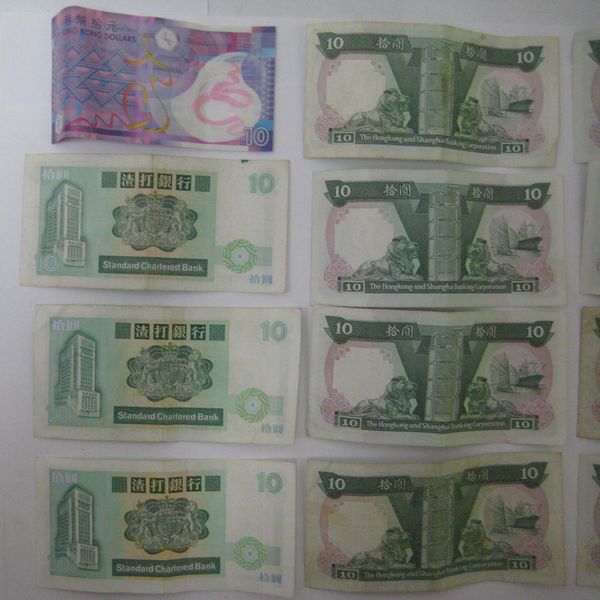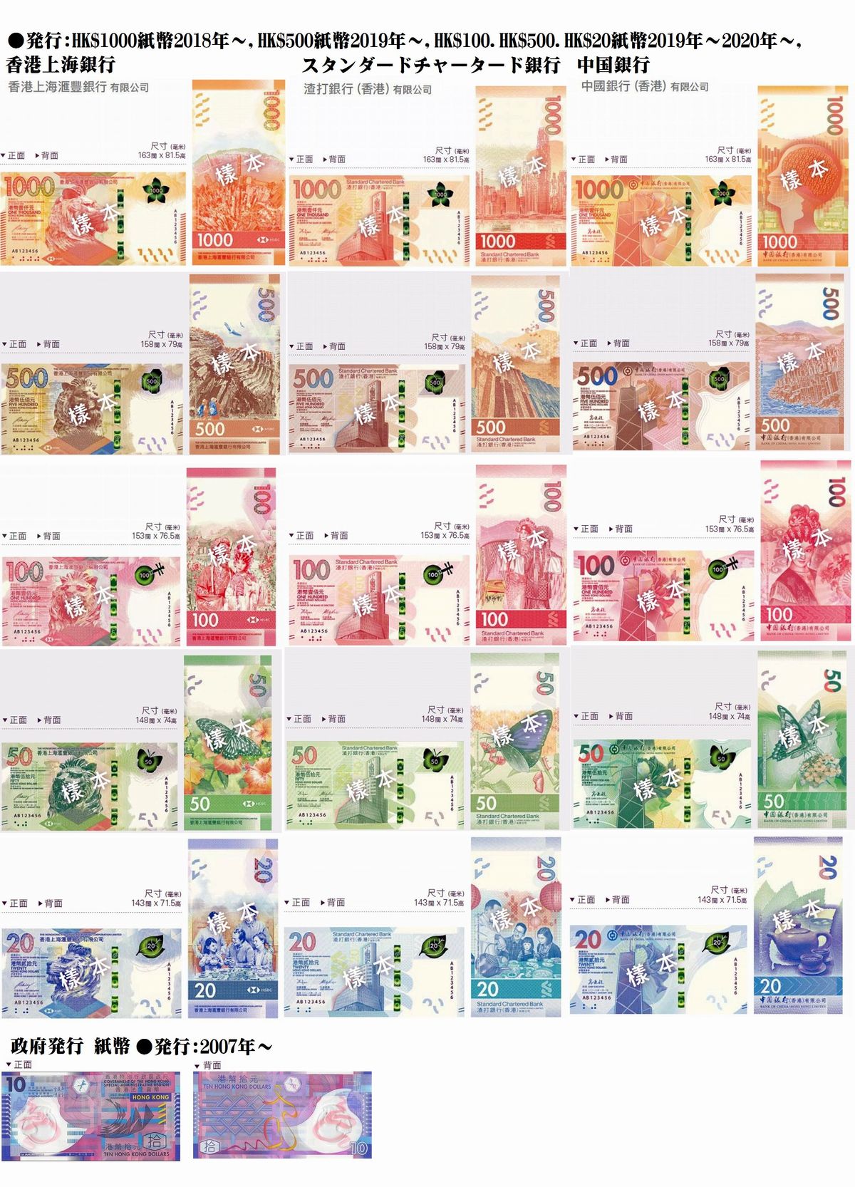 ↓現行紙幣の種類となります。色で金額が統一されております。また、背面は縦型ですので(10香港ドル券を除く)新旧は判断しやすいかもしれません。