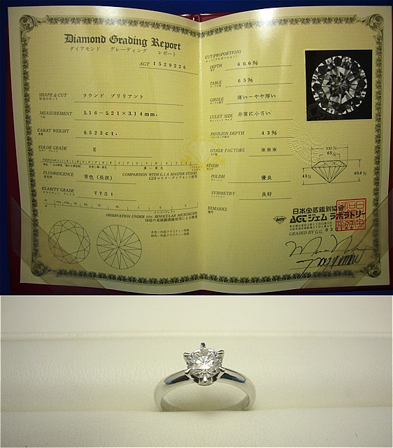 奈良県香芝市からお越しのお客様よりAGTジュムラボラトリー鑑定書付き0.523ct プラチナ ダイヤモンドリング 指輪をお買取りさせて頂きました!
