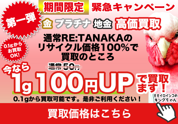 金・プラチナともに相場上昇中です!ただ今貴金属買取キャンペーン実施中!RE:TANAKAより1g100円UPで買取致します!もちろん現金でお支払い!石付でもOKです。是非ご利用ください!