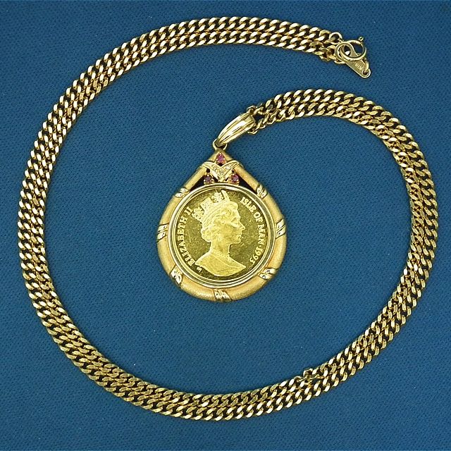 奈良市押熊町よりご来店!K24純金 マン島 キャットコイン 1/5oz 金貨付ペンダント K18金ネックレスを買取させて頂きました!