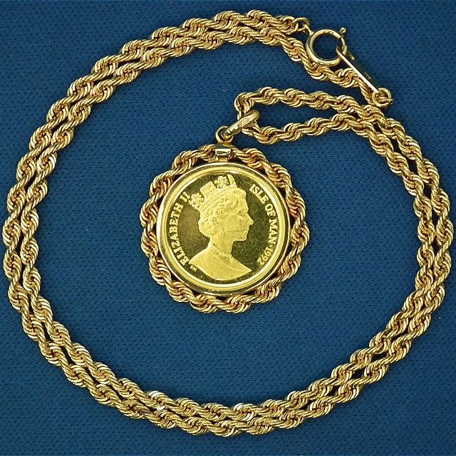 生駒市中菜畑よりご来店!K24純金 マン島 キャットコイン 1/10oz 金貨付ペンダント K18金ネックレスを買取させて頂きました!