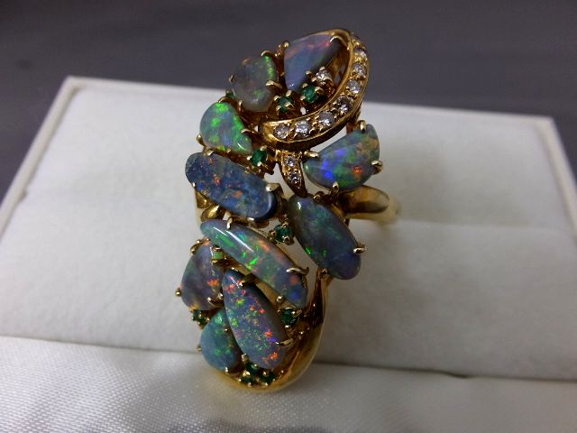 ブラックオパールやセミブラックが散りばめられとても上品な1点ものです。そして、ダイヤモンドやエメラルドが素敵な脇役となっているリングです。