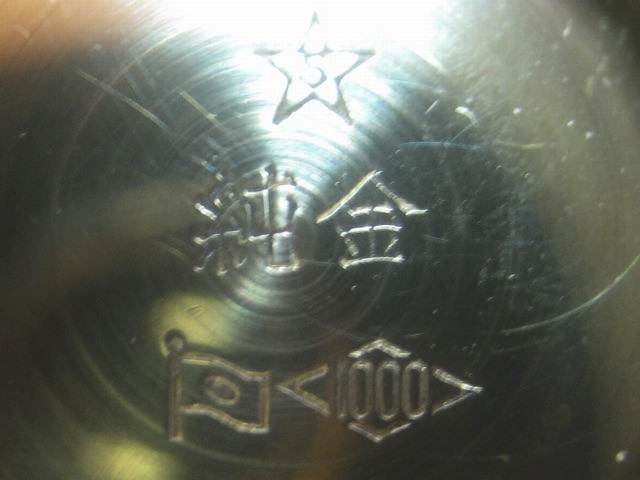 貴金属製品の場合必ず何処かの位置に品位を表す刻印がございます。本品の場合、高台の内側にホールマークと一緒にありました。