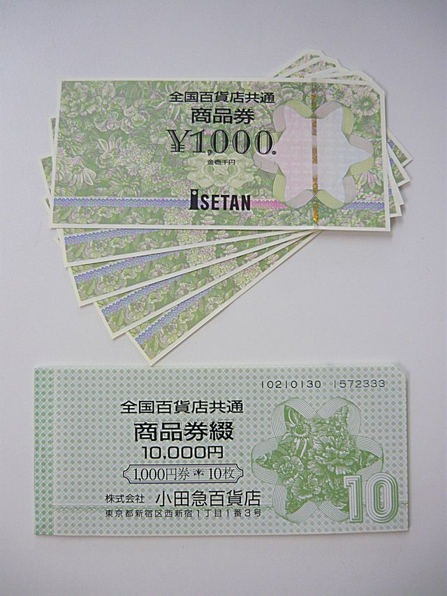 伊東市内からお越しのお客様から、全国百貨店共通商品券1000円×15枚を額面の97.5%でお買取りさせていただきました!