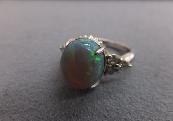 カボションカットのオパールリングです。ブラックオパール風ですが、セミブラックという感じですね。石の高さもありとても素敵な石です。しかし非常に残念なことに、通称カンと呼ばれる割れがあります。