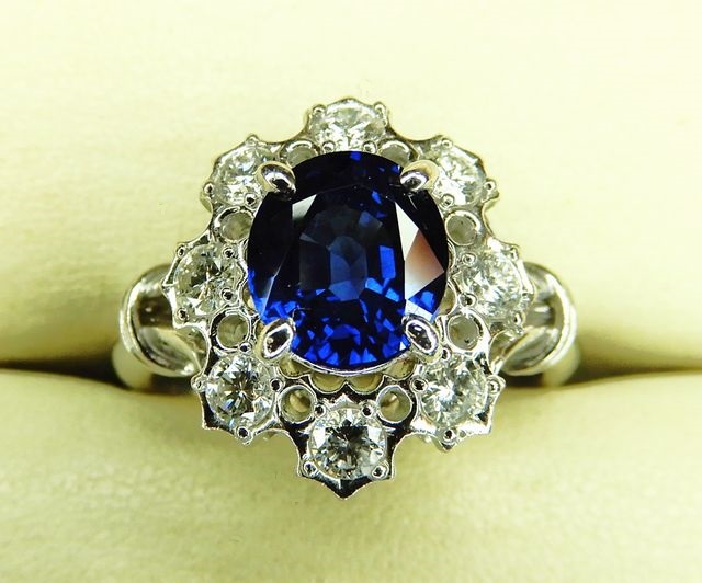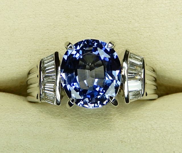 | 石 | 2.2ct 非加熱サファイヤ、0.3ct メレーダイヤ |