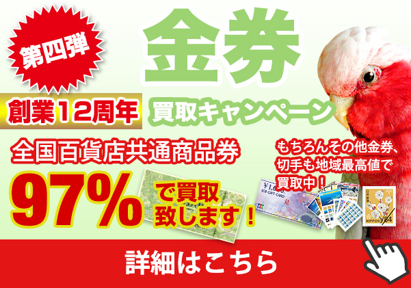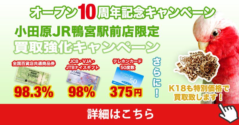 鴨宮店10周年記キャンペーン価格!百貨店共通商品券96%、JCBギフト券96%、テレカ50度数1枚375円にてお買取りします!