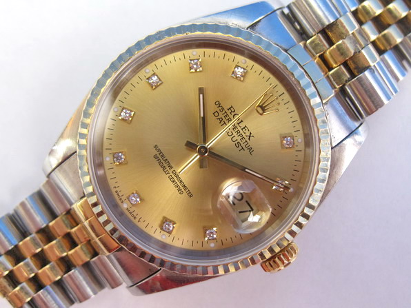 デイトジャストはその名の通り0時00分ちょうどでカチっとカレンダーが変わることで有名になったロレックスの大ヒット時計です。今回の69174は前モデル6917からの変更点は風防がプラスチックからサファイヤガラスになったことでです。ベゼルにはホワイトゴールドが使用されさりげない高級感が醸し出しています。